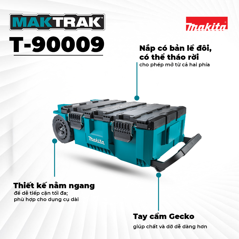 Makita MAKTRAK™ is the Next Generation in modular storage. The MAKTRAK™ Rolling Tool Chest (T-90009) is a modular storage solution to transport, access, store and organize job site equipment, with a horizontal design for maximum accessibility and to fit long tools. It has a holding capacity of 5,000 cu.in. and up to 250 lbs. The Rolling Tool Chest features a premium handle with Gecko Grips™ for easy truck/van loading and unloading, and 9″ All-Terrain wheels for jobsite use. The horizontal design fits under a truck bed cover for ease of transport. It’s equipped with large glove-friendly latches for easy access, and the dual hinged removable lid allows access from both sides.
